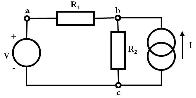 The circuit in Fig. 147 has three nodes: a, b and c, four branches: a-b, a-c and two b-c branches and three loops: one loop consisting of a voltage source V, and resistors \(R_{1}\) and \(R_{2}\), one consisting of the voltage source V, resistor \(R_{1}\) and current source \(I\), and one loop consisting of resistor \(R_{2}\) and current source \(I\).