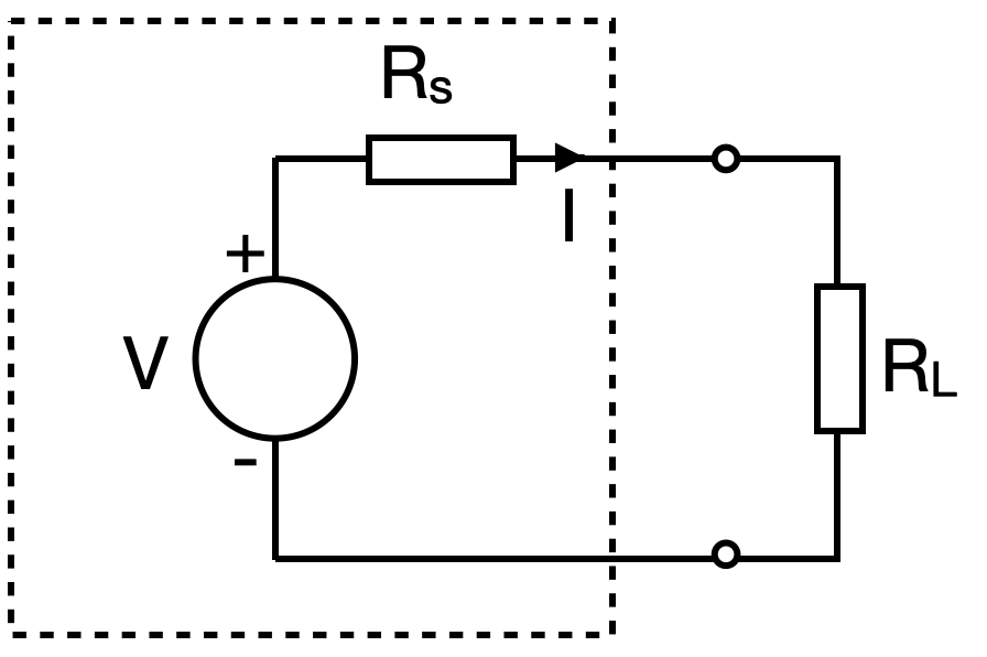For an ideal voltage source the output voltage \(V_{\rm AB}\) is constant, regardless the magnitude of the current \(I\) and therefore independent of load \(R_{\rm L}\). For an ideal voltage source \(R_{\rm s}\) equals zero must apply.