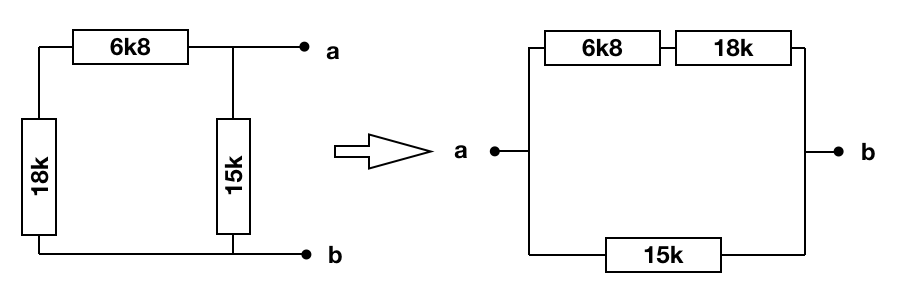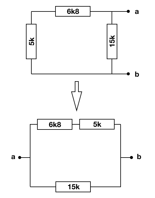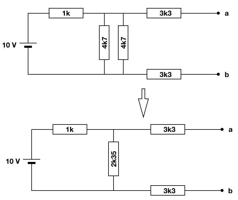 Assuming the voltage source is ideal, its resistance is 0 \(\Omega\). By replacing the voltage source by its internal resistance, \(R_{\rm Th}\) is obtained by determining the resistance between terminals \(a\) and \(b\) in Fig. 7: