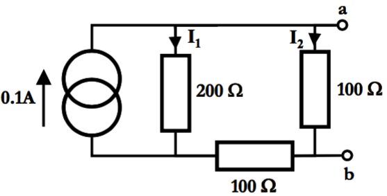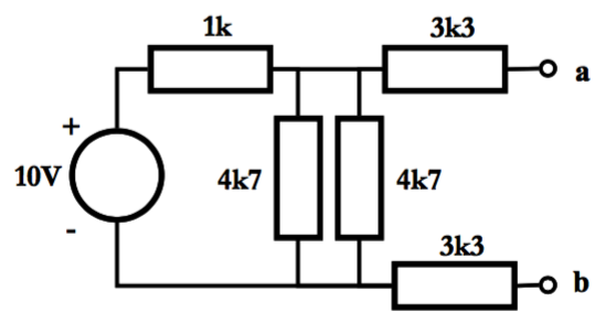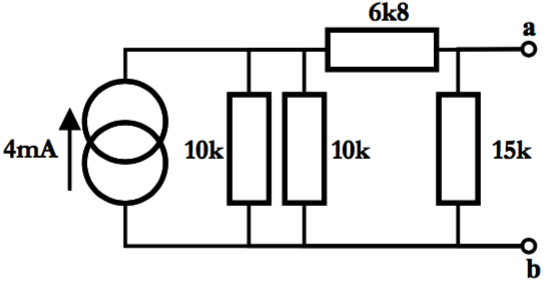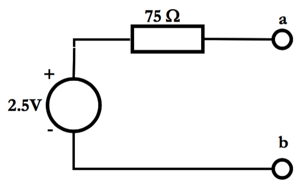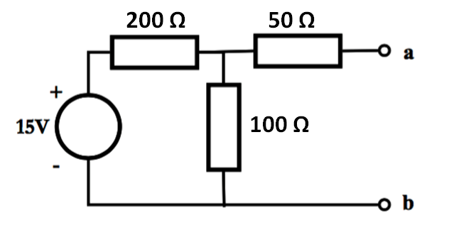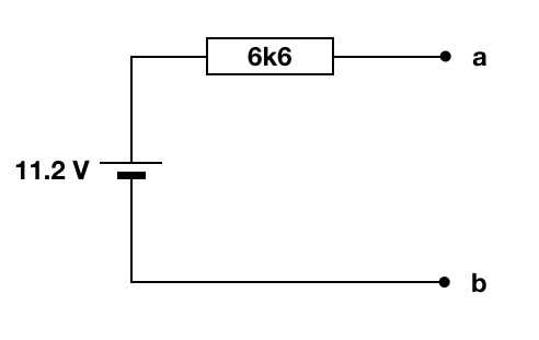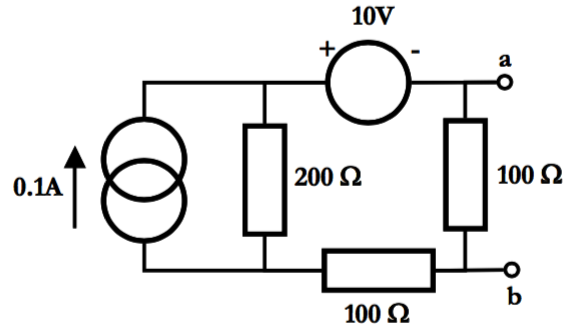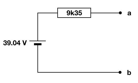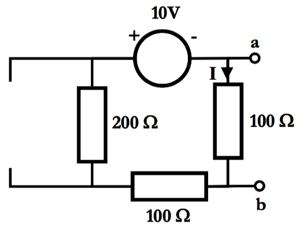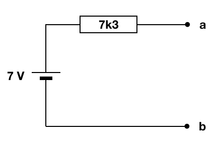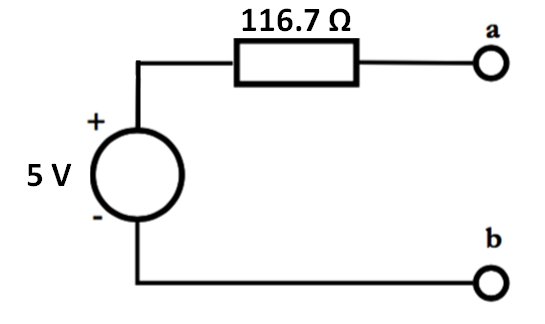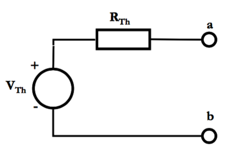 where \(V_{\rm open}\) is the open-circuit potential difference and \(I_{\rm SC}\) is the short-circuit current obtained when terminals \(a\) and \(b\) are short cut.