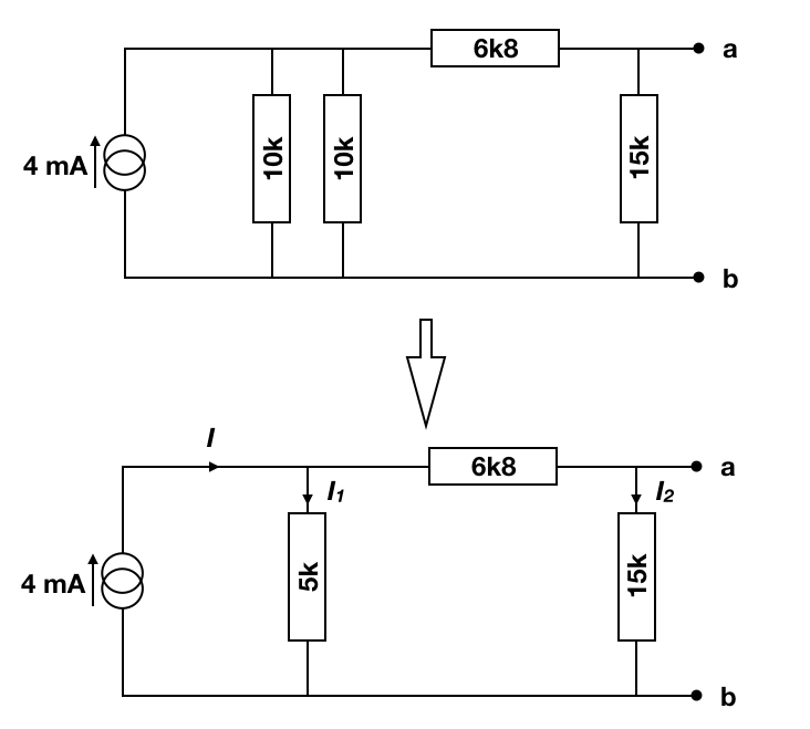 To calculate the contribution of the current source the voltage source is short cut (i.e. replaced by its internal resistance). This results in the circuit shown in Fig. 19.