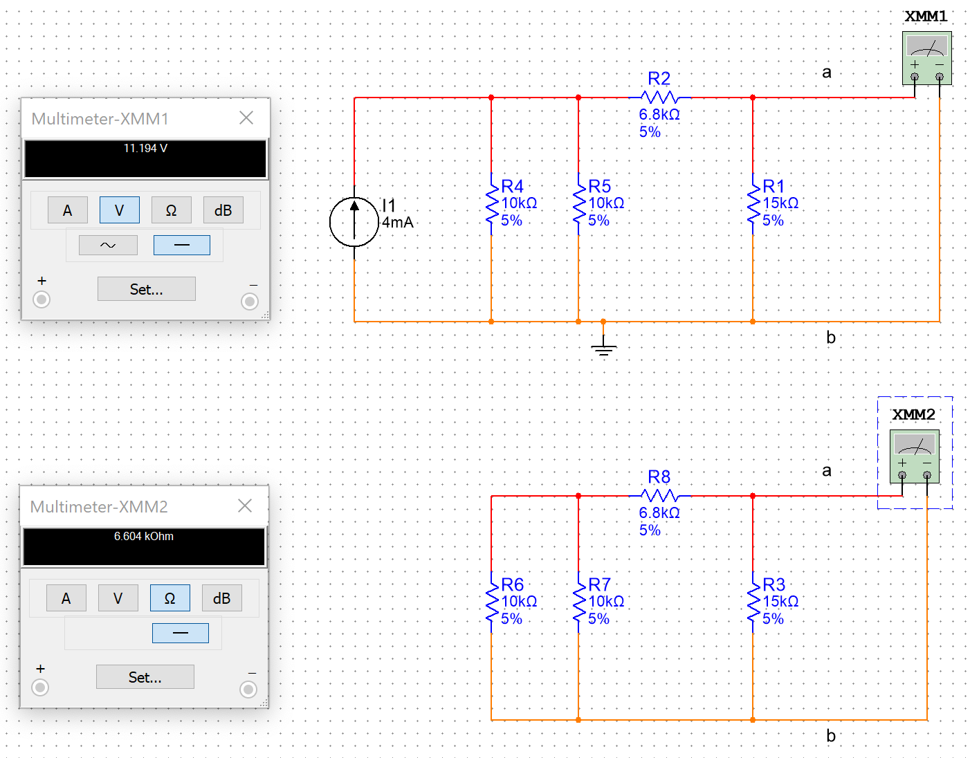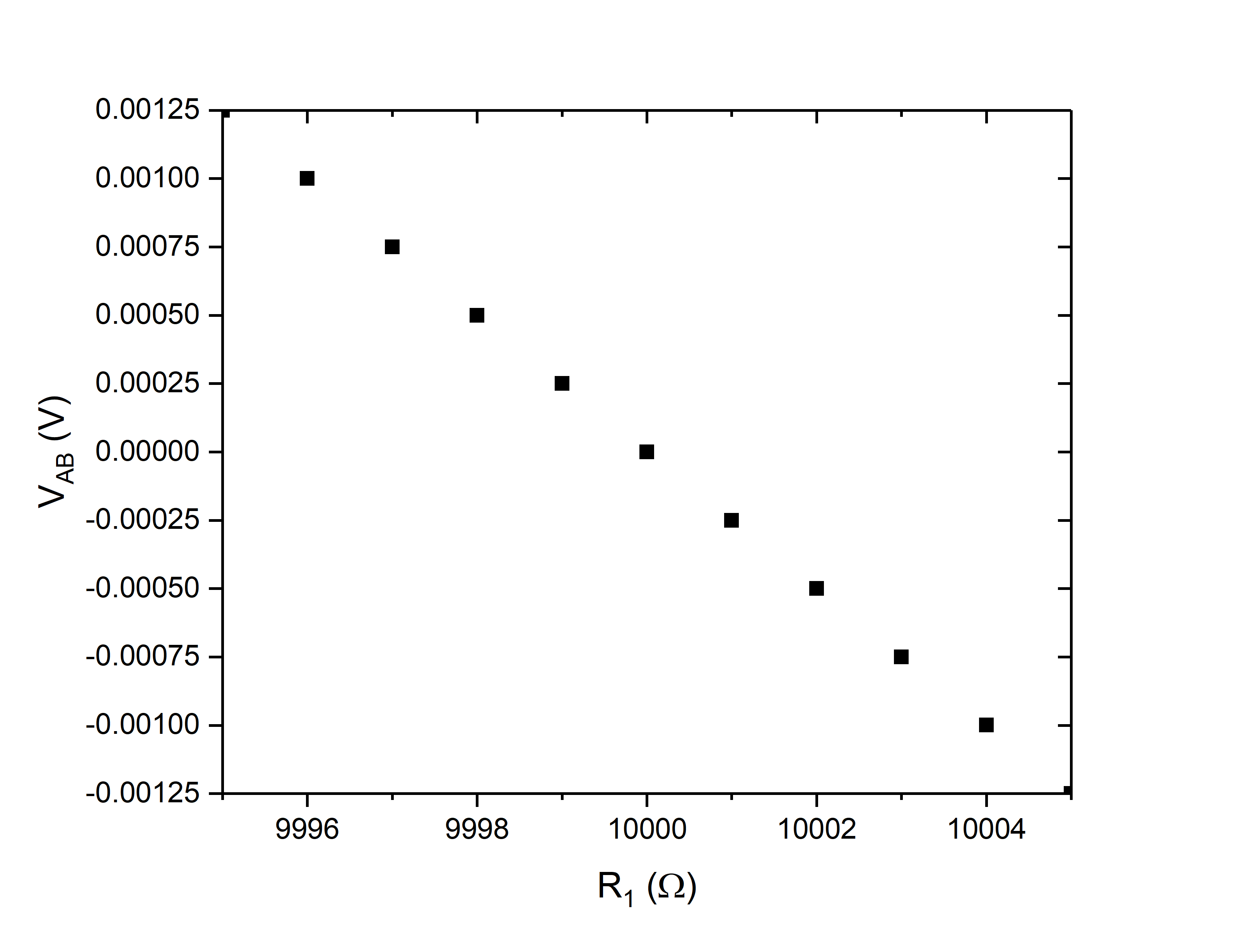 Open Mult 3.3 and check for a number of values of \(R_1\) the open potential differences \(V_{\rm AB}\).
