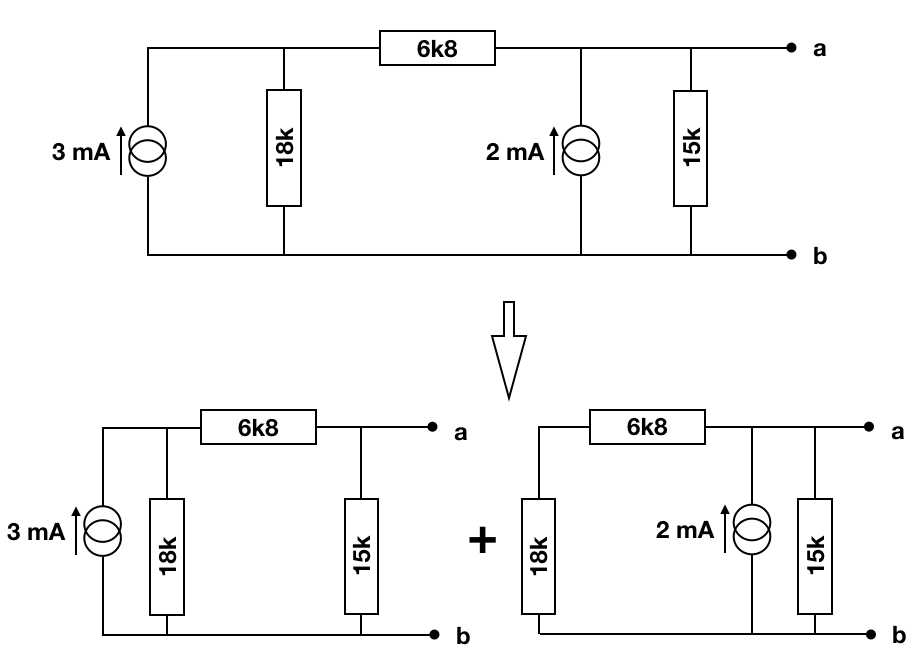 The potential difference across a certain element in a circuit containing several sources can be obtained by determining the potential differences across that element due to each source, whereby all other sources are replaced by their internal resistances. The overall potential difference across the element is given by the algebraic sum of the separately determined potential differences.