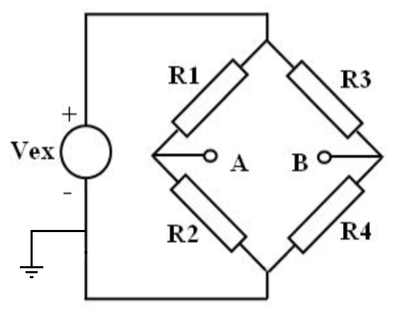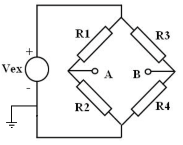 One way of do this is by using a Wheatstone bridge. A Wheatstone bridge is constructed using two parallel voltage dividers \(R_1 / R_2\) and \(R_3 / R_4\).