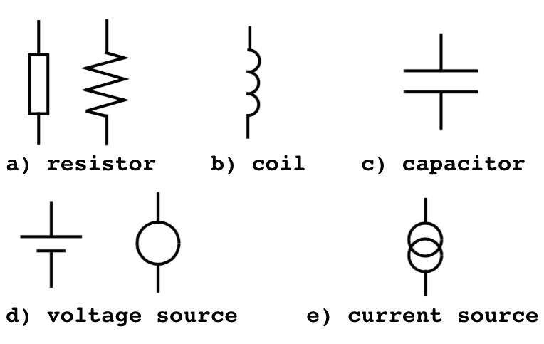 The five basic elements for electronic circuits are resistance (\(R\)), coil (\(L\)), capacitor (\(C\)), voltage source (\(V\)) and current source (\(I\)) as shown in Fig. 4.