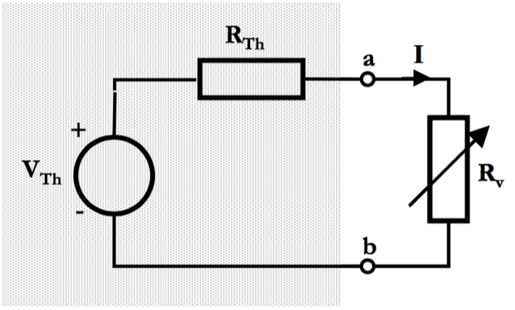 A simpler method is to vary \(R_{\rm v}\) until \(V_{\rm ab} = \frac{1}{2} V^{\rm open}_{\rm ab}\). For this resistance value \(R_{\rm v} = R_{\rm Th}\) (check this!). Using eqn. (2) \(I_{\rm SC}\) can be obtained.