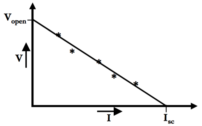 \(I_{\rm SC}\) is the short cut current. In general it is not wise to measure this current directly as it might damage the circuit. It is possible to measure \(I_{\rm SC}\) indirectly.