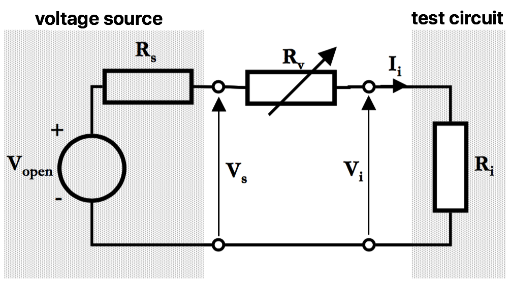 Measure the output potential difference \(V_{\rm s}\) of the voltage source and the input potential difference \(V_{\rm i}\) of the test circuit. Vary \(R_{\rm v}\) until \(V_{\rm i} = \frac{1}{2} V_{\rm s}\). Then \(R_{\rm i} = R_{\rm v}\) (check this!).