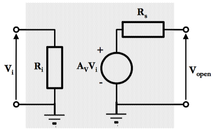 \(V_{\rm i}\) is the input potential difference, \(R_{\rm i}\) the effective input impedance, \(A_{\rm v}V_{\rm i}\) the equivalent Thévenin voltage source, \(A_{\rm v}\) the voltage amplification, and \(R_{\rm s}\) the Thévenin output impedance. Note that the Thévenin voltage source is not an actual voltage source, but rather a voltage source dependent on the input potential difference.