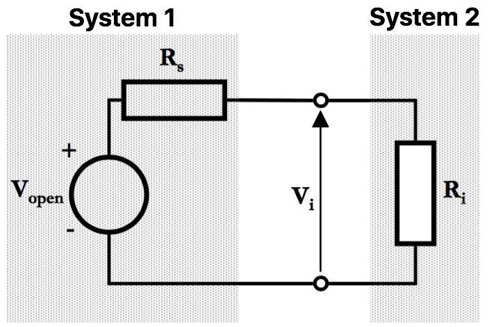 Fig. 33 shows a schematic, where system 1 is a voltage source with an open potential difference \(V_{\rm open}\) and output impedance \(R_{\rm s}\) and system 2 is characterized by the input impedance \(R_{\rm i}\).
