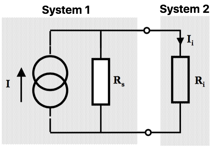 Fig. 34 shows a schematic, where system 1 is a current source \(I\) with an output impedance \(R_{\rm s}\) and system 2 is characterized by the input impedance \(R_{\rm i}\).